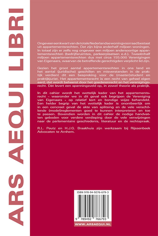 In dit cahier wordt het wettelijk kader van het appartementsrecht – waaronder we in dit geval ook begrijpen de Vereniging van Eigenaars - op relatief kort en bondige wijze behandeld. Een helder begrip van het wettelijk kader is onontbeerlijk om in een concreet geval de akte van splitsing en de vele verschillende (model)reglementen goed te kunnen interpreteren en toe te passen. Bovendien worden in dit cahier de nodige handvatten geboden voor verdere verdieping door de vele verwijzingen naar de parlementaire geschiedenis, literatuur en de rechtspraak.