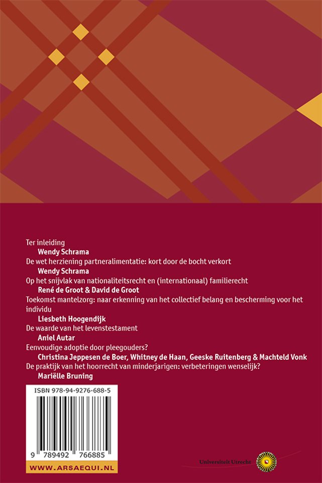 In de Ars Aequi UCERF-reeks worden de actuele ontwikkeling in het familierecht beschreven en geanalyseerd door de wetenschappers van het Utrecht Centre for European Research into Family Law (UCERF). Het centrum heeft zijn bestaansrecht in de afgelopen tien jaar bewezen: toonaangevend wetenschappelijk onderzoek, gepubliceerd in vooraanstaande tijdschriften en bundels, succesvolle verwerving en uitvoering van omvangrijk 3e geldstroomonderzoek en internationale onderscheidingen en prijzen.