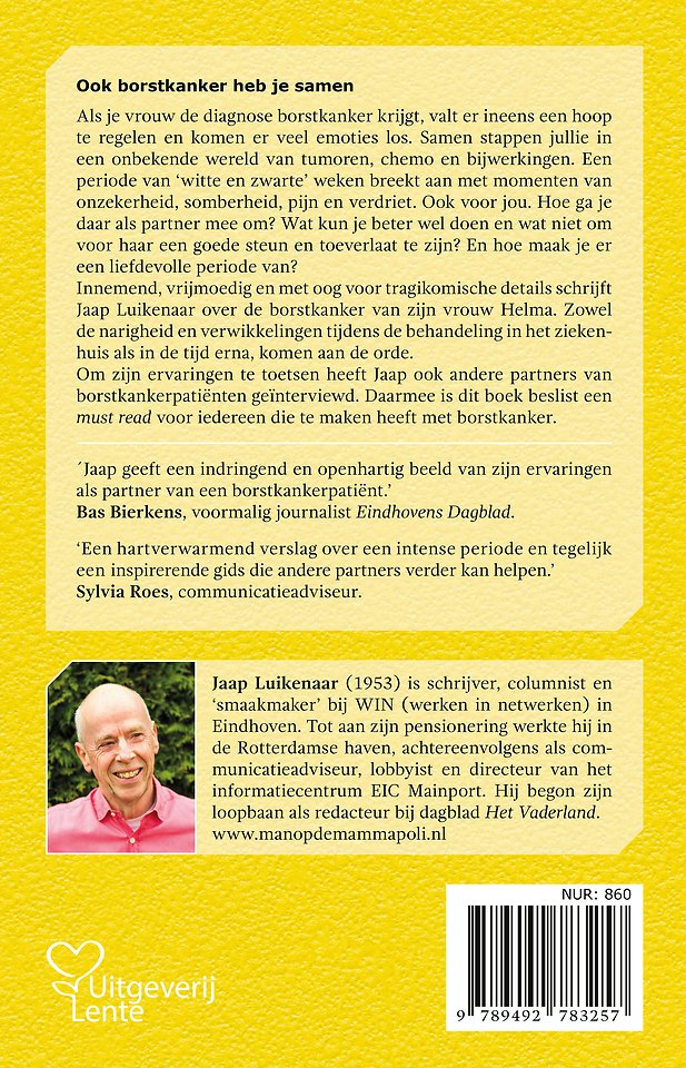 Om zijn ervaringen te toetsen heeft Jaap ook andere partners van borstkankerpatiënten geïnterviewd. Daarmee is dit boek beslist een must read voor iedereen die te maken heeft met borstkanker.