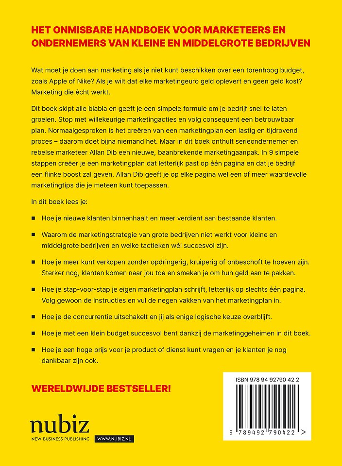 Normaalgesproken is het creëren van een marketingplan een lastig en tijdrovend proces – daarom doet bijna niemand het. Maar in dit boek onthult serieondernemer en rebelse marketeer Allan Dib een nieuwe, baanbrekende marketingaanpak. In 9 simpele stappen creëer je een marketingplan dat letterlijk past op één pagina en dat je bedrijf een flinke boost zal geven. Allan Dib geeft je op elke pagina wel een of meer waardevolle marketingtips die je morgen al kunt toepassen.