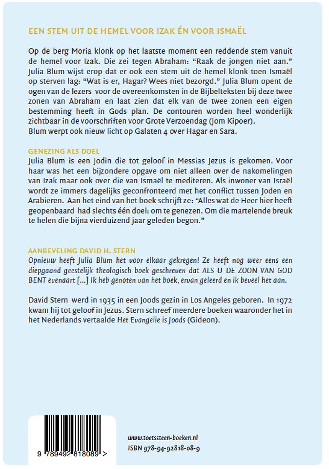 Julia Blum is een Jodin die tot geloof in Messias Jezus is gekomen. Voor haar was het een bijzondere opgave om niet alleen over de nakomelingen van Izak maar ook over die van Ismaël te mediteren. Als inwoner van Israël wordt ze immers dagelijks geconfronteerd met het conflict tussen Joden en Arabieren. Aan het eind van het boek schrijft ze: “Alles wat de Heer hier heeft geopenbaard had slechts één doel: om te genezen. Om die martelende breuk te helen die bijna vierduizend jaar geleden begon.”