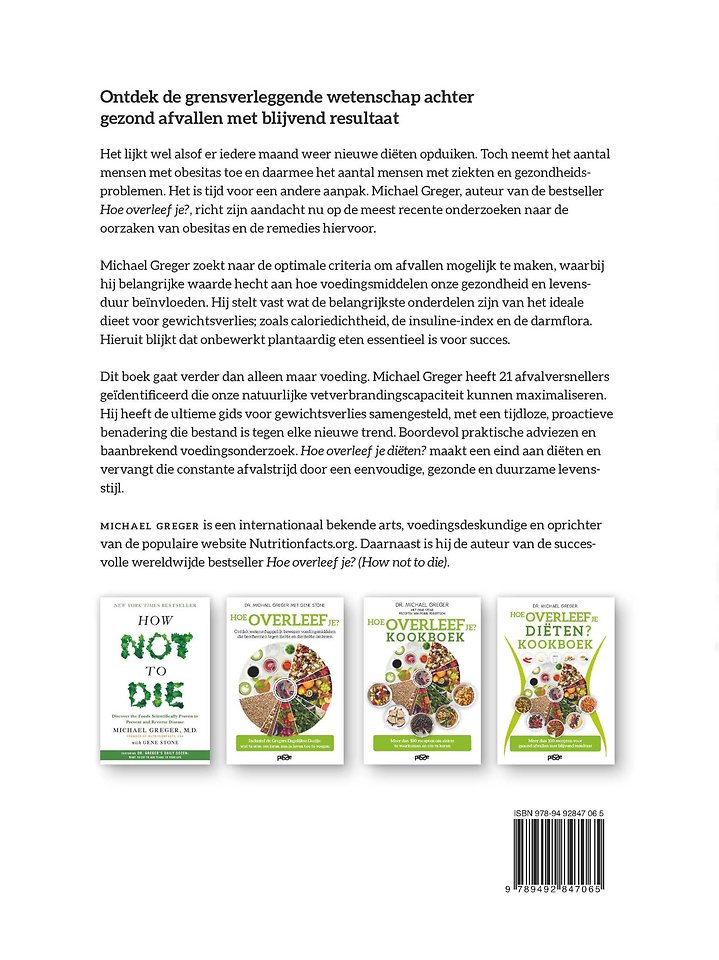 Dit boek gaat verder dan alleen maar voeding. Michael Greger heeft 21 afvalversnellers geïdentificeerd die onze natuurlijke vetverbrandingscapaciteit kunnen maximaliseren. Hij heeft de ultieme gids voor gewichtsverlies samengesteld, met een tijdloze, proactieve benadering die bestand is tegen elke nieuwe trend. Boordevol praktische adviezen en baanbrekend voedingsonderzoek. Hoe overleef je diëten? maakt een eind aan diëten en vervangt die constante afvalstrijd door een eenvoudige, gezonde en duurzame levensstijl.