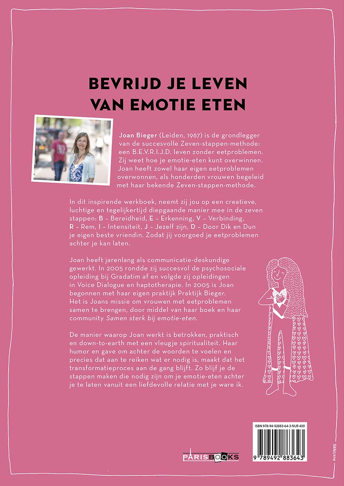 In dit creatie boek, neemt zij jou op een creatieve, luchtige en tegelijkertijd diepgaande manier mee in de zeven stappen: B – Bereidheid, E – Erkenning, V – Verbinding, R – Rem, I – Intensiteit, J – Jezelf zijn, D – Door Dik en Dun je eigen beste vriendin. Zodat jij voorgoed je eetproblemen achter je kan laten.