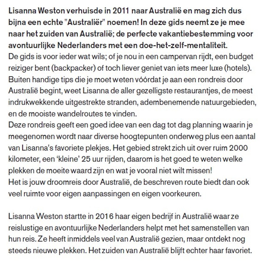 In deze reisgids neemt auteur Lisanna Weston de lezer mee naar het zuiden van Australië. Naar hoogtepunten als Sydney, de Blue Mountains, Melbourne, de Great Ocean Road en Adelaide - de reis van Sydney naar Adelaide is een must en staat op ieders lijstje - maar ook naar onbekend, verborgen parels.