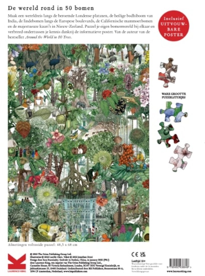 Ontdek de verrassende wereld van bomen met deze gedetailleerde puzzel van 1000 stukjes, geïllustreerd door Lucille Clerc, met teksten uit Jonathan Drori’s succesvolle boek. Een reis via de inheemse bomen van Groot-Brittannië, de Indiase heilige banyan, de Europese boulevards met hun lindebomen, de Californische sequoiabossen, naar de majestueuze kauribomen in Nieuw-Zeeland en nog veel meer. Tijdens het puzzelen lees en leer je over de geschiedenis, de wetenschap en de cultuur met betrekking tot ’s werelds mooiste bomen.