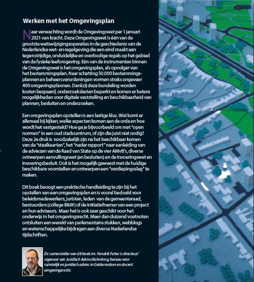 Het boek Werken met het Omgevingsplan beoogt een praktische handleiding te zijn bij het opstellen van een omgevingsplan. Meer dan duizend voetnoten ontsluiten een wereld van parlementaire stukken, webblogs en wetenschappelijke bijdragen aan diverse Nederlandse tijdschriften.