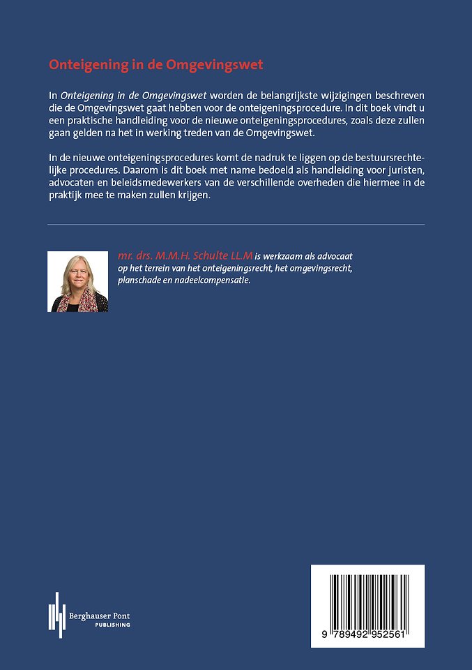 In Onteigening in de Omgevingswet worden de belangrijkste wijzigingen beschreven die de Omgevingswet gaat hebben voor de onteigeningsprocedure. In dit boek vind u een praktische handleiding voor de nieuwe onteigeningsprocedures, zoals deze zullen gaan gelden na het in werking treden van de Omgevingswet.