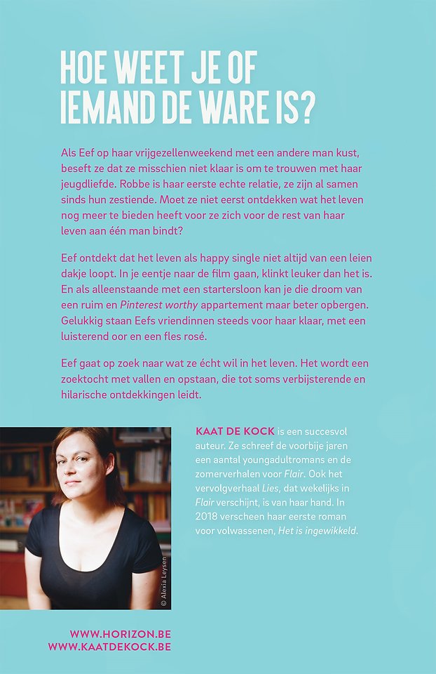 Als Eef op haar vrijgezellenweekend met een andere man kust, beseft ze dat ze misschien niet klaar is om te trouwen met haar jeugdliefde Robbe. Moet ze niet eerst ontdekken wat het leven nog meer te bieden heeft voor ze zich voor de rest van haar leven aan een man bindt? Eef gaat op zoek naar antwoorden, een avontuur dat tot verbijsterende én hilarische ontdekkingen leidt.
