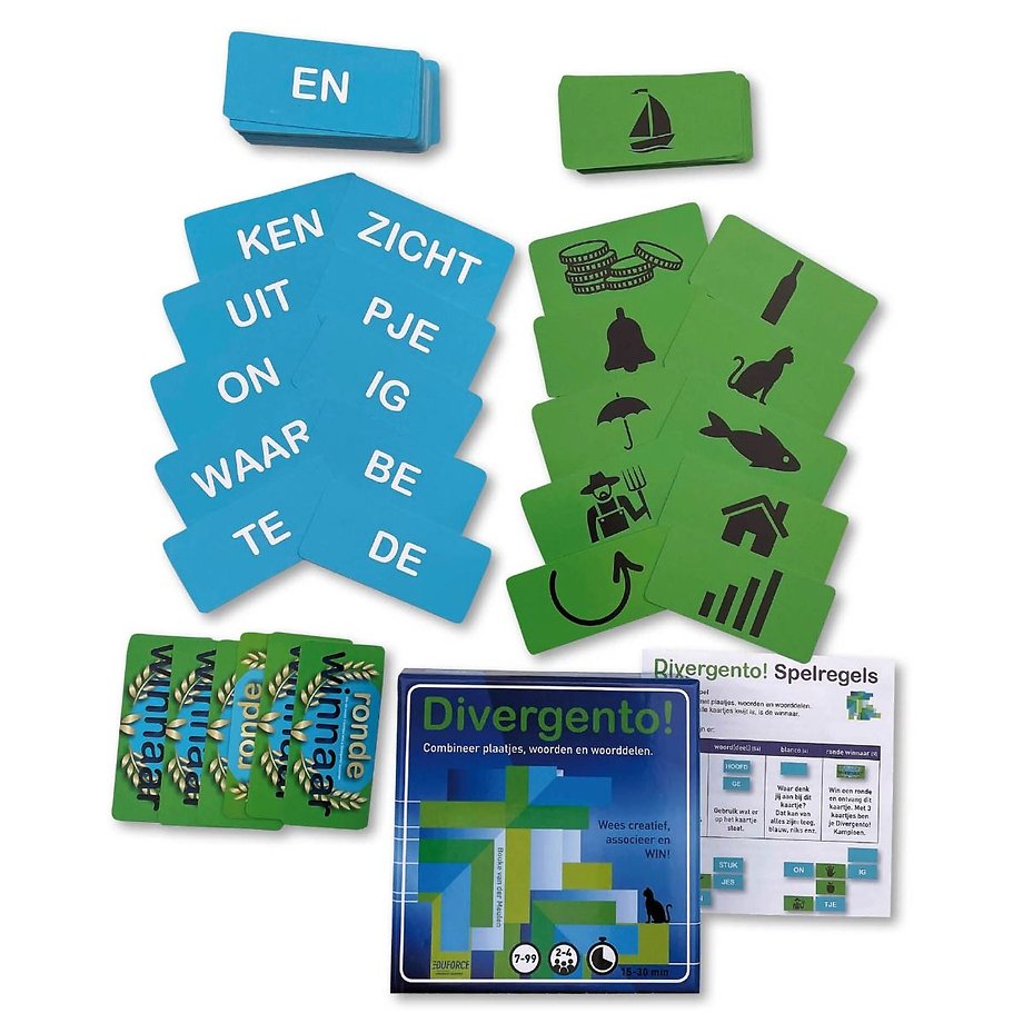 Er zijn kaartjes met afbeeldingen, met woorden en met woorddelen. En er zijn blanco kaartjes die heel divers ingezet kunnen worden. De verschillende kaartjes worden gecombineerd, zodat ze een woord vormen. Na het eerste uitleggen, mag er bij andere woorden aangelegd worden. De speelwijze kan heel goed worden vergeleken met Rummikub en Scrabble. Divergento! wordt met twee tot vier spelers gespeeld en gemiddeld duurt een ronde 15 tot 30 minuten. Er kan gestreden worden voor het Divergento! Kampioenschap. Degene die als eerste 3 ronde-winnaar-kaartjes verdient, is de kampioen.