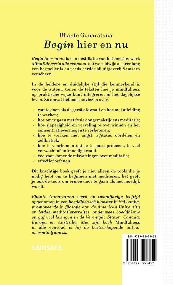 Begin hier en nu is een destillatie van het meesterwerk Mindfulness in alle eenvoud, dat wereldwijd al jarenlang een bestseller is en reeds eerder bij uitgeverij Samsara verscheen.