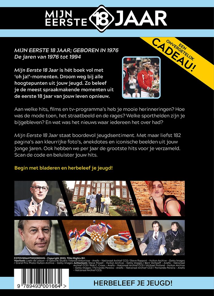 Mijn Eerste 18 Jaar staat boordevol jeugdsentiment. Met maar liefst 182 pagina’s aan kleurrijke foto’s, anekdotes en iconische beelden uit jouw jonge jaren. Ook hebben we per jaar de grootste hits voor je verzameld. Scan de code en beluister jouw hits.