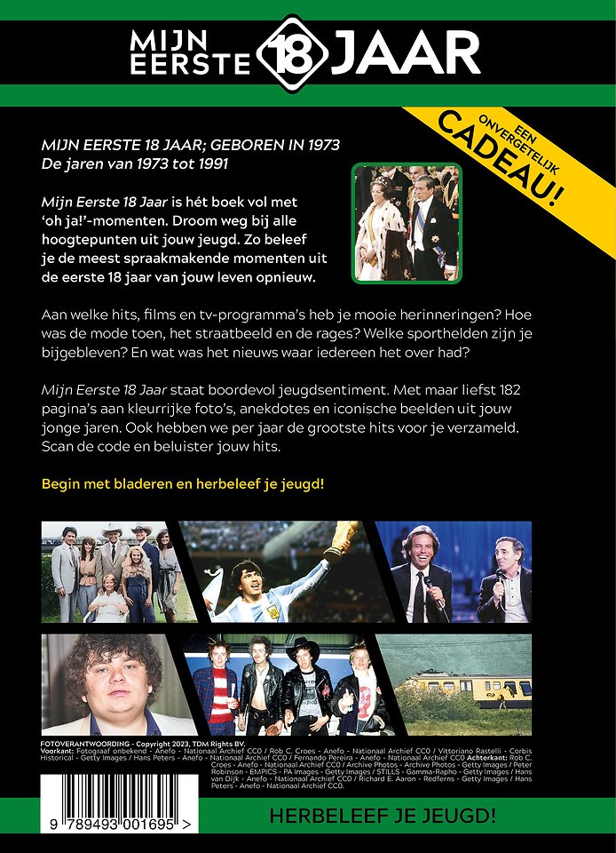 Mijn Eerste 18 Jaar staat boordevol jeugdsentiment. Met maar liefst 182 pagina’s aan kleurrijke foto’s, anekdotes en iconische beelden uit jouw jonge jaren. Ook hebben we per jaar de grootste hits voor je verzameld. Scan de code en beluister jouw hits.