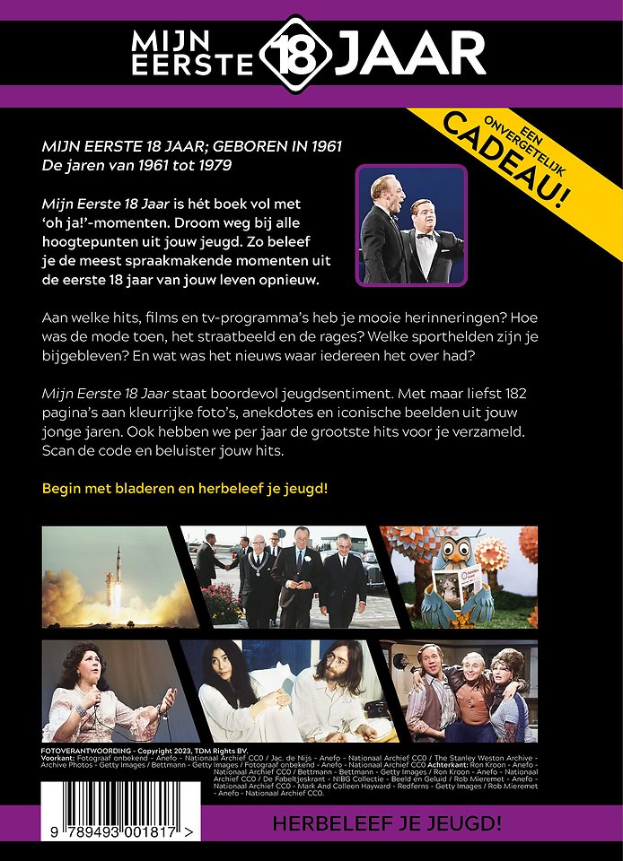 Mijn Eerste 18 Jaar staat boordevol jeugdsentiment. Met maar liefst 182 pagina’s aan kleurrijke foto’s, anekdotes en iconische beelden uit jouw jonge jaren. Ook hebben we per jaar de grootste hits voor je verzameld. Scan de code en beluister jouw hits.