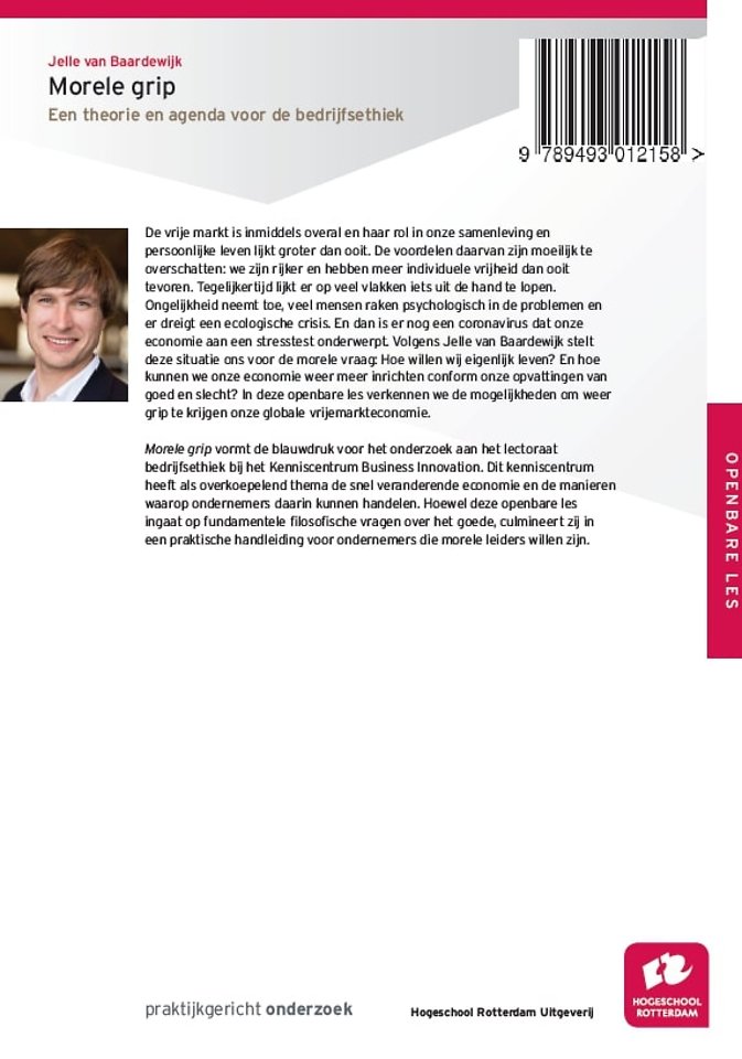 De vrije markt is inmiddels overal en haar rol in onze samenleving en persoonlijke leven lijkt groter dan ooit. De voordelen daarvan zijn moeilijk te overschatten: we zijn rijker en hebben meer individuele vrijheid dan ooit tevoren. Tegelijkertijd lijkt er op veel vlakken iets uit de hand te lopen. Ongelijkheid neemt toe, veel mensen raken psychologisch in de problemen en er dreigt een ecologische crisis. En dan is er nog een coronavirus dat onze economie aan een stresstest onderwerpt. Volgens Jelle van Baardewijk stelt deze situatie ons voor de morele vraag: Hoe willen wij eigenlijk leven? En hoe kunnen we onze economie weer meer inrichten conform onze opvattingen van goed en slecht? In deze openbare les verkennen we de mogelijkheden om weer grip te krijgen onze globale vrijemarkteconomie. Morele grip vormt de blauwdruk voor het onderzoek aan het lectoraat bedrijfsethiek bij het Kenniscentrum Business Innovation. Dit kenniscentrum heeft als overkoepelend thema de snel veranderende economie en de manieren waarop ondernemers daarin kunnen handelen. Hoewel deze openbare les ingaat op fundamentele filosofische vragen over het goede, culmineert zij in een praktische handleiding voor ondernemers die morele leiders willen zijn.