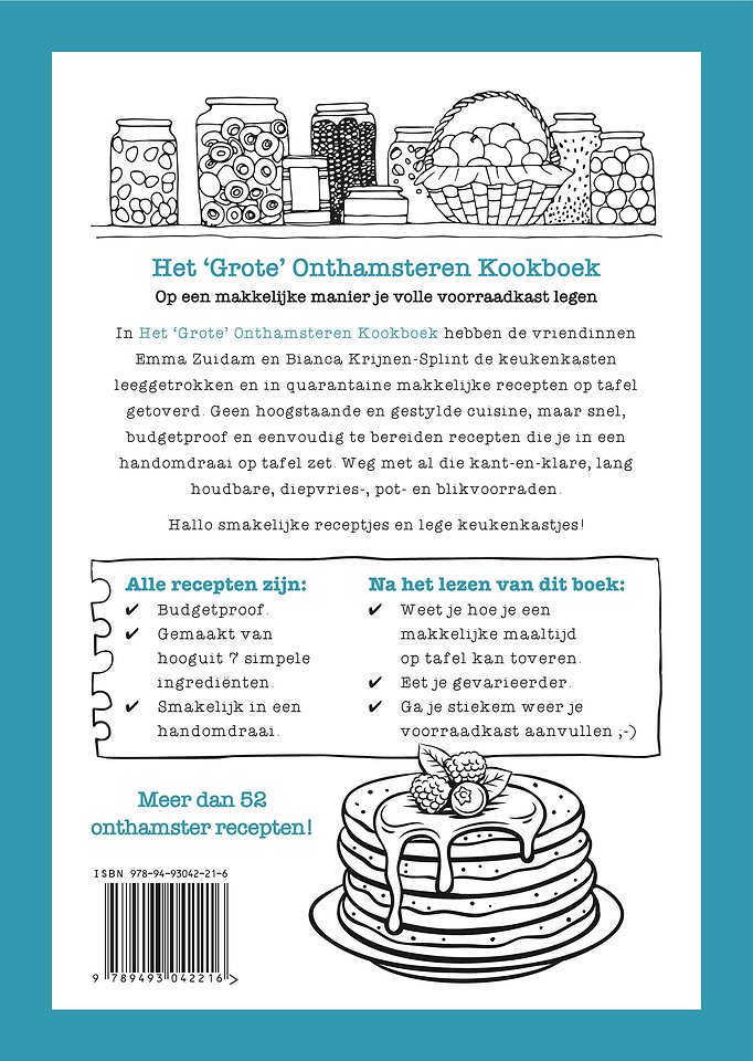 In Het ‘Grote’ Onthamsteren Kookboek hebben de vriendinnen Emma Zuidam en Bianca Krijnen-Splint de keukenkasten leeggetrokken en in quarantaine makkelijke recepten op tafel getoverd. Geen hoogstaande en gestylde cuisine, maar snel, budgetproof en eenvoudig te bereiden recepten die je in een handomdraai op tafel zet. Weg met al die kant-en-klare, lang houdbare, diepvries-, pot- en blikvoorraden.