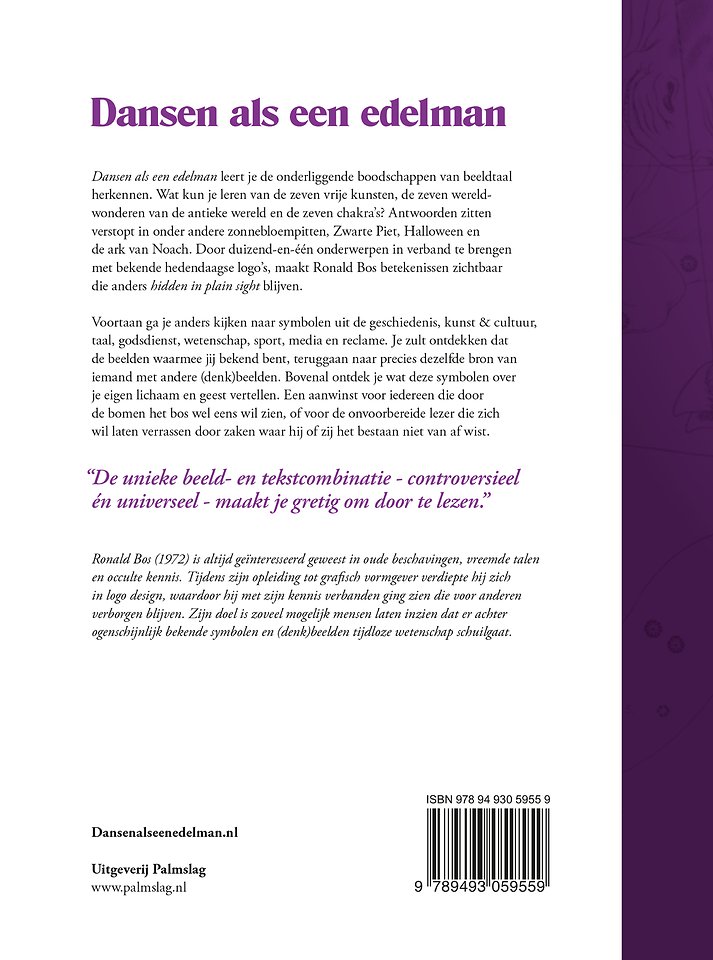 Dansen als een edelman leert je de onderliggende boodschappen van beeldtaal herkennen. Wat kun je leren van de zeven vrije kunsten, de zeven wereldwonderen van de antieke wereld en de zeven chakra’s? Antwoorden zitten verstopt in onder andere zonnebloempitten, Zwarte Piet, Halloween en de ark van Noach. Door duizend-en-één culturele onderwerpen in verband te brengen met bekende hedendaagse logo’s, maakt Ronald Bos betekenissen zichtbaar die anders ‘hidden in plain sight’ blijven.