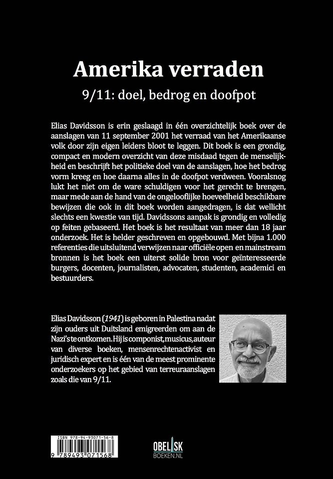 Elias Davidsson is erin geslaagd in één overzichtelijk boek over de aanslagen van 11 september 2001 het verraad van het Amerikaanse volk door zijn eigen leiders bloot te leggen. Dit boek is een grondig, compact en modern overzicht van deze misdaad tegen de menselijkheid en beschrijft het politieke doel van de aanslagen, hoe het bedrog vorm kreeg en hoe daarna alles in de doofpot verdween. Vooralsnog lukt het niet om de ware schuldigen voor het gerecht te brengen, maar mede aan de hand van de ongelooflijke hoeveelheid beschikbare bewijzen die ook in dit boek worden aangedragen, is dat wellicht slechts een kwestie van tijd. Davidssons aanpak is grondig en volledig op feiten gebaseerd. Het boek is het resultaat van meer dan 18 jaar onderzoek. Het is helder geschreven en opgebouwd. Met bijna 1.000 referenties die uitsluitend verwijzen naar officiële open en mainstream bronnen is het boek een uiterst solide bron voor geïnteresseerde burgers, docenten, journalisten, advocaten, studenten, academici en bestuurders.