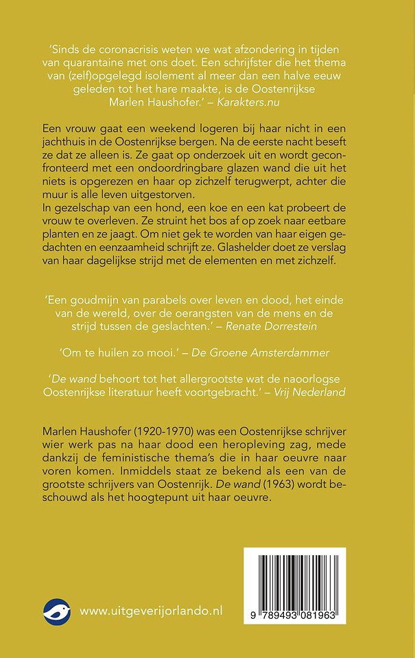 In gezelschap van een hond, een koe en een kat probeert de vrouw te overleven. Ze struint het bos af op zoek naar eetbare planten en ze jaagt. Om niet gek te worden van haar eigen gedachten en eenzaamheid schrijft ze. Glashelder doet ze verslag van haar dagelijkse strijd met de elementen en met zichzelf.