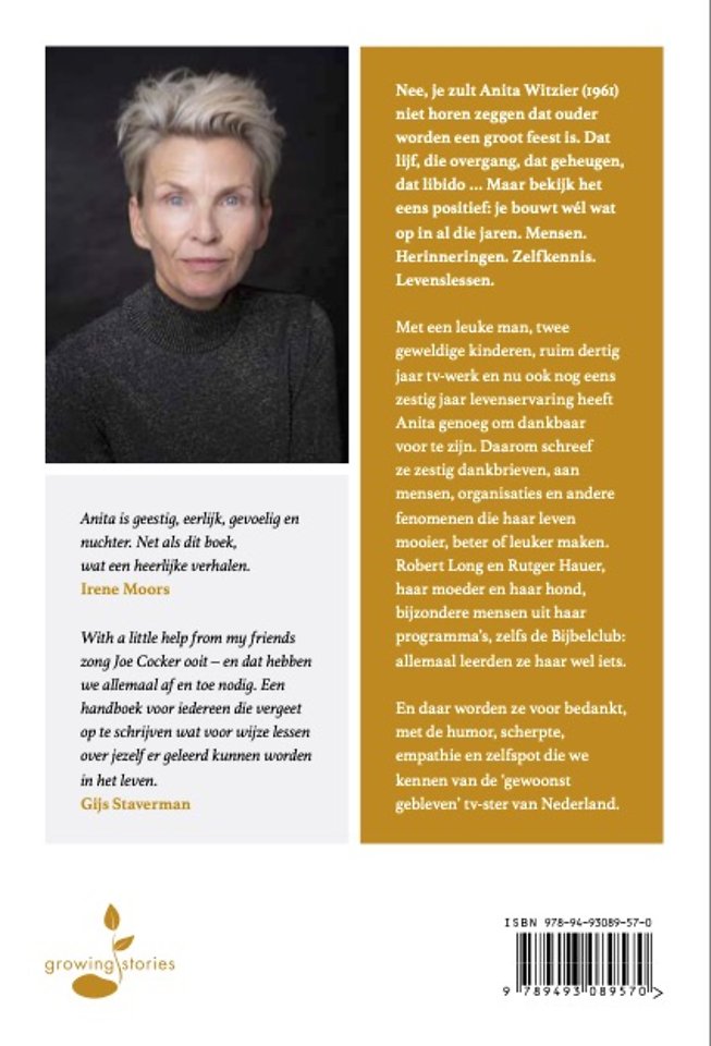 Met een leuke man, een koninklijke onderscheiding, twee geweldige kinderen, ruim dertig jaar tv-werk en nu ook nog eens zestig jaar levenservaring heeft Anita genoeg om dankbaar voor te zijn. Daarom schreef ze zestig dankbrieven, aan mensen, organisaties en andere fenomenen die haar leven mooier, beter of leuker maken. Robert Long en Rutger Hauer, haar moeder en haar hond, de meest bijzondere mensen uit haar programma’s, zelfs de Bijbelclub: allemaal leerden ze haar wel iets. En daar worden ze voor bedankt, met de humor, de scherpte, de empathie en de zelfspot die we kennen van de ‘gewoonst gebleven’ tv-ster van Nederland.