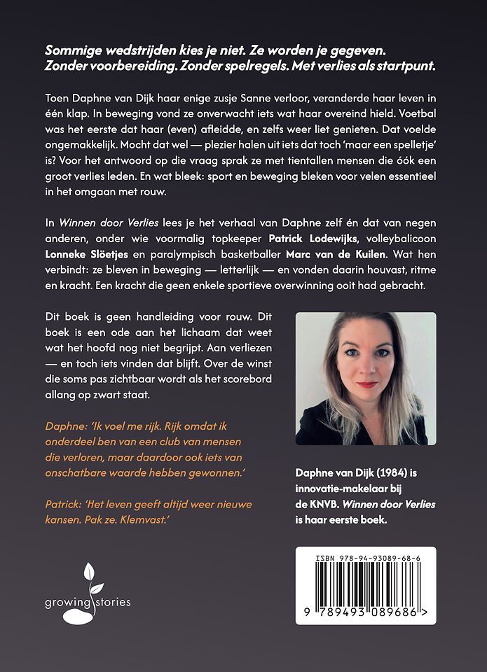 In Winnen door Verliezen lees je het verhaal van Daphne zelf én dat van negen anderen, onder wie voormalig topkeeper Patrick Lodewijks, volleybalicoon Lonneke Slöetjes en paralympisch basketballer Marc van de Kuilen. Wat hen verbindt: ze bleven in beweging — letterlijk — en vonden daarin houvast, ritme en kracht. Een kracht die geen enkele sportieve overwinning ooit had gebracht.