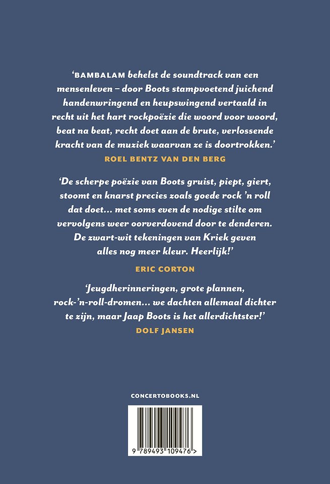 In Bambalam neemt Jaap Boots de lezer mee op een opwindende poëtische trip langs zijn rock-’n-roll-dromen, -fantasieën en -ontmoetingen. In toegankelijke gedichten en met soepele stijl laat hij zien hoe artiesten als Jerry Lee Lewis, Tom Waits, Martha Reeves, Nick Cave, David Bowie, Iggy Pop en Bruce Springsteen maar ook bands als Echo & The Bunnymen, The Smiths, Oasis en AC/DC de soundtrack van zijn leven vormen. Mede door de illustraties van Erik Kriek is Bambalam een zinderende bundel geworden, waar pop-, rock- én stripliefhebbers hun helden -en soms ook zichzelf- in zullen herkennen.