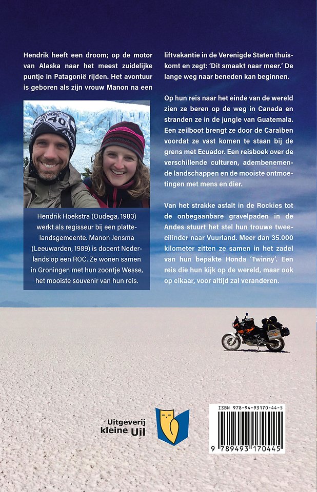 Manon schrijft over de verschillende culturen, adembenemende landschappen en de mooiste ontmoetingen met mens en dier. Hendrik neemt de lezer mee in de praktische kant van het reizen. De onvoorspelbare techniek van de oude motor, corrupte grensovergangen en een huiveringwekkende lift van een psychopathische vrachtautochauffeur.