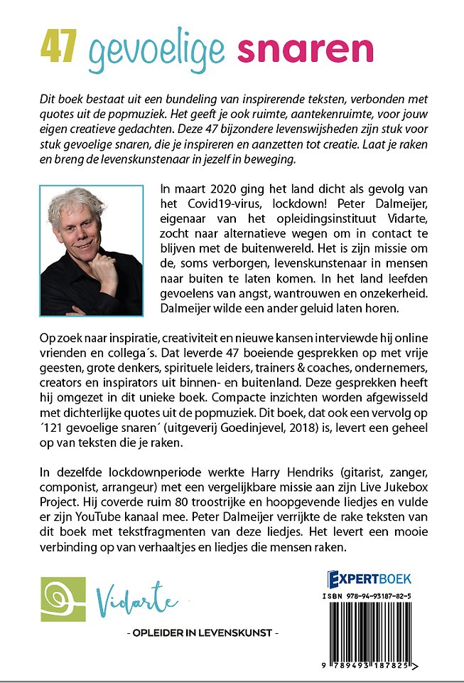 Op zoek naar inspiratie, creativiteit en nieuwe kansen interviewde hij online vrienden en collega´s. Dat leverde 47 boeiende gesprekken op met vrije geesten, grote denkers, spirituele leiders, trainers & coaches, ondernemers, creators en inspirators uit binnen- en buitenland. Deze gesprekken heeft hij omgezet in dit unieke boek. Compacte inzichten worden afgewisseld met dichterlijke quotes uit de popmuziek. Dit boek, dat ook een vervolg op ´121 gevoelige snaren´ (uitgeverij Goedinjevel, 2018) is, levert een geheel op van teksten die je raken.