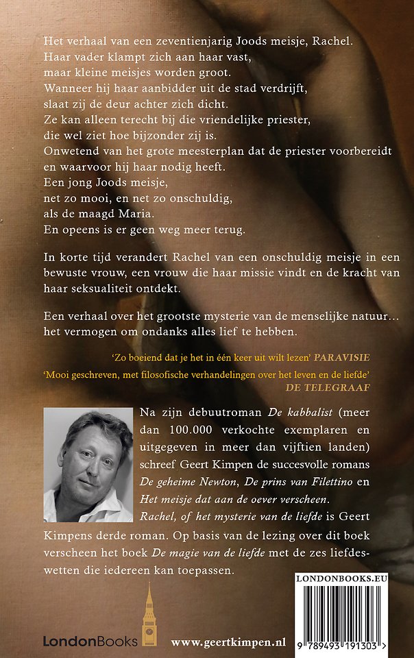 Na zijn debuutroman De kabbalist (meer dan 100.000 verkochte exemplaren en uitgegeven in meer dan vijftien landen) schreef Geert Kimpen de succesvolle romans De geheime Newton, De prins van Filettino en Het meisje dat aan de oever verscheen. Rachel, of het mysterie van de liefde is Geert Kimpens derde roman. Op basis van de lezing over dit boek verscheen het boek De magie van de liefde met de zes liefdeswetten die iedereen kan toepassen.