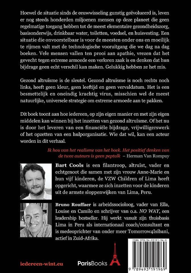 Dit boek toont aan hoe iedereen, op zijn eigen manier en met zijn eigen middelen kan winnen bij het inzetten van gezond altruïsme. Of het nu is door het leveren van een financiële bijdrage, vrijwilligerswerk of het opzetten van een hulporganisatie. Wie dat wil, kan een acteur worden in dit verhaal.