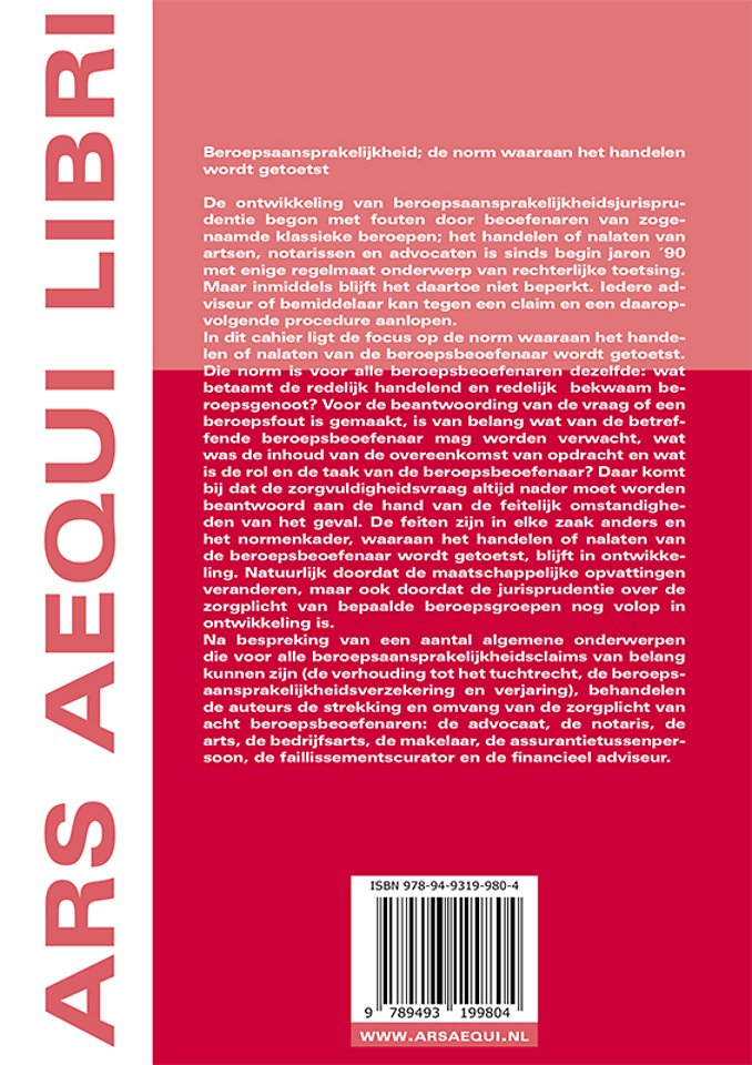 Na bespreking van een aantal algemene onderwerpen die voor alle beroepsaansprakelijkheidsclaims van belang kunnen zijn (de verhouding tot het tuchtrecht, de beroepsaansprakelijkheidsverzekering en verjaring), behandelen de auteurs de strekking en omvang van de zorgplicht van acht beroepsbeoefenaren: de advocaat, de notaris, de arts, de bedrijfsarts, de makelaar, de assurantietussenpersoon, de faillissementscurator en de financieel adviseur.