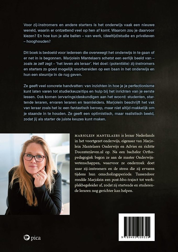 Dit boek is bedoeld voor iedereen die overweegt het onderwijs in te gaan of er net in is begonnen. Marjolein Mantelaers schetst een eerlijk beeld van – zoals ze zelf zegt – ‘het leven als leraar’. Het doel: (potentiële) zij-instromers en starters zo goed mogelijk voorbereiden op een baan in het onderwijs en hun een steuntje in de rug geven.