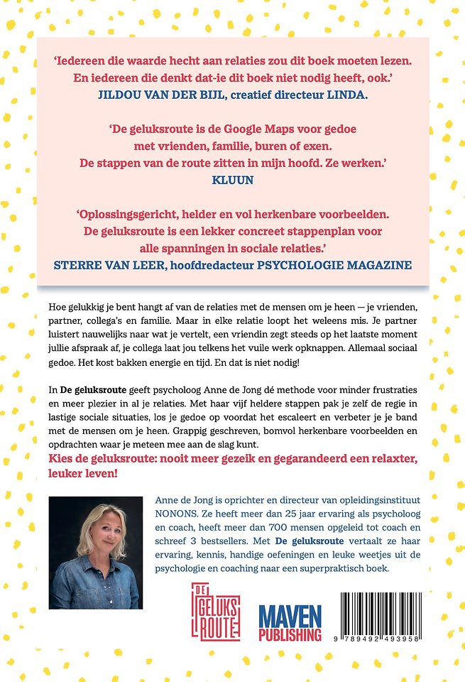 In 'De geluksroute' geeft psycholoog Anne de Jong dé methode voor minder frustraties en meer plezier in al je relaties. Met haar vijf heldere stappen pak je zelf de regie in lastige sociale situaties, los je gedoe op voordat het escaleert en verbeter je je band met de mensen om je heen. Grappig geschreven, bomvol herkenbare voorbeelden en opdrachten waar je meteen mee aan de slag kunt.