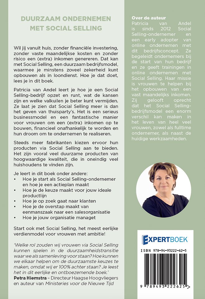 Patricia van Andel leert je hoe je een Social Selling-bedrijf opzet en runt, wat de kansen zijn en welke valkuilen je beter kunt vermijden. Ze laat je zien dat Social Selling meer is dan het geven van thuisparty’s. Het is een serieus businessmodel en een fantastische manier voor vrouwen om een (extra) inkomen op te bouwen, financieel onafhankelijk te worden en hun droom om te ondernemen te realiseren.