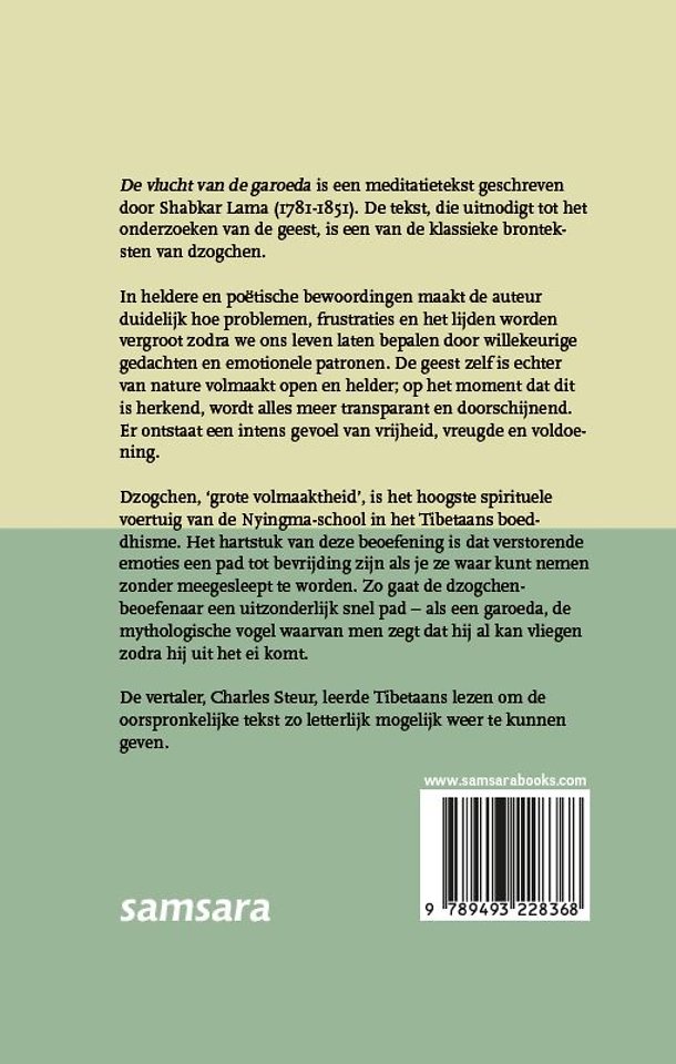 Dzogchen, ‘Grote Volmaaktheid’, is het hoogste spirituele voertuig van de nyingmaschool in het Tibetaans boeddhisme. Het hartstuk van deze beoefening is dat verstorende emoties een pad tot bevrijding zijn wanneer je ze waar kunt nemen zonder meegesleept te worden. Dan kun je ze laten voor wat ze zijn. Zo gaat de Dzogchen-beoefenaar een uitzonderlijk snel pad – als een garoeda, de mythologische vogel waarvan men zegt dat hij al kan vliegen zodra hij uit het ei komt.