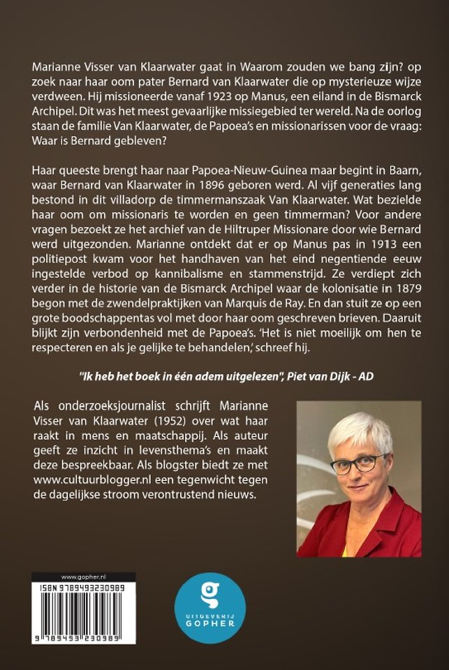 Marianne Visser van Klaarwater gaat in Waarom zouden we bang zijn? op zoek naar haar oom pater Bernard van Klaarwater die op mysterieuze wijze verdween. Hij missioneerde vanaf 1923 op Manus, een eiland in de Bismarck Archipel. Dit was het meest gevaarlijke missiegebied ter wereld. Na de oorlog staan de familie Van Klaarwater, de Papoea’s en missionarissen voor de vraag: Waar is Bernard gebleven?