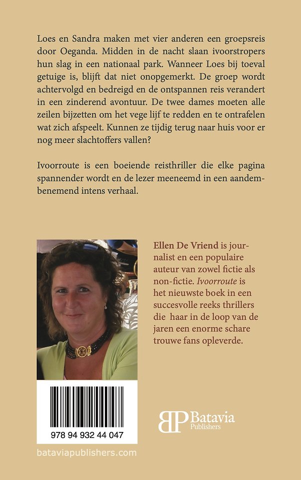 Ellen De Vriend is journalist en een populaire auteur van zowel fictie als non-fictie. Ivoorroute is het nieuwste boek in een succesvolle reeks thrillers die haar in de loop van de jaren een enorme schare trouwe fans opleverde.
