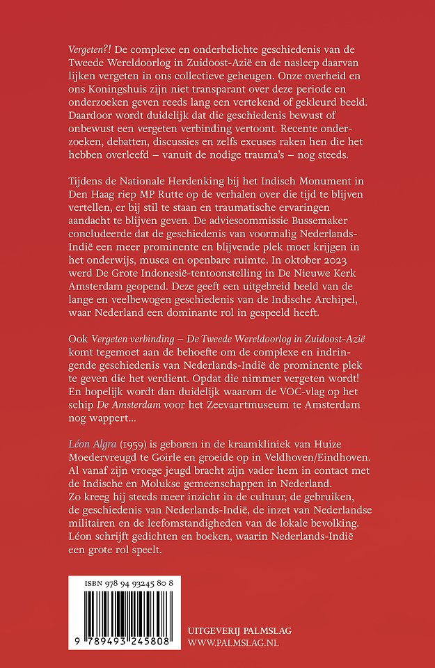 Vergeten?! De complexe en onderbelichte geschiedenis van de Tweede Wereldoorlog in Zuidoost-Azië en de nasleep daarvan lijken vergeten in ons collectieve geheugen. Onze overheid en ons Koningshuis zijn niet transparant over deze periode en onderzoeken geven reeds lang een vertekend of gekleurd beeld. Daardoor wordt duidelijk dat die geschiedenis bewust of onbewust een vergeten verbinding vertoont. Recente onderzoeken, debatten, discussies en zelfs excuses raken hen die het hebben overleefd – vanuit de nodige trauma’s – nog steeds.