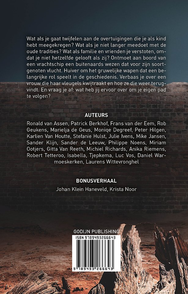 Wat als je gaat twijfelen aan de overtuigingen die je als kind hebt meegekregen? Wat als je niet langer meedoet met de oude tradities? Wat als familie en vrienden je verstoten omdat je niet hetzelfde gelooft als zij? Ontmoet aan boord van een vrachtschip een buitenaards wezen dat voor zijn soortgenoten vlucht. Huiver om het gruwelijke wapen dat een belangrijke rol speelt in de geschiedenis. Verbaas je over een vrouw die haar vleugels kwijtraakt en hoe ze die weer terugvindt. En vraag je af: wat heb jij ervoor over om je eigen pad te volgen?