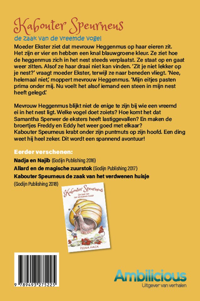 Fiona Hack schreef en publiceerde eerder een avontuur van Kabouter Speurneus. Dat ging over de zaak van het verdwenen huisje. Voor beide boeken verzorgde Lydia Klop-Steendijk.