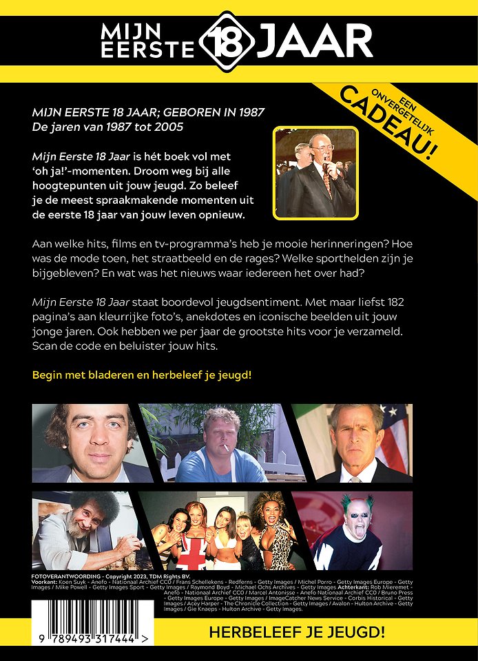 Mijn Eerste 18 Jaar staat boordevol jeugdsentiment. Met maar liefst 182 pagina’s aan kleurrijke foto’s, anekdotes en iconische beelden uit jouw jonge jaren. Ook hebben we per jaar de grootste hits voor je verzameld. Scan de code en beluister jouw hits.