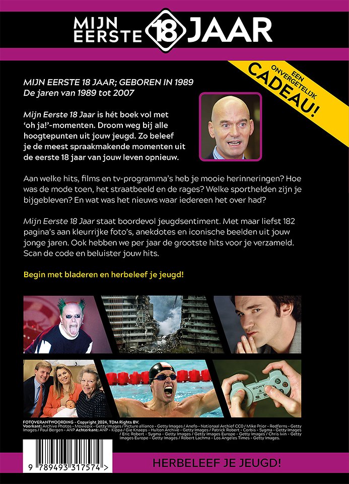 Mijn Eerste 18 Jaar staat boordevol jeugdsentiment. Met maar liefst 182 pagina’s aan kleurrijke foto’s, anekdotes en iconische beelden uit jouw jonge jaren. Ook hebben we per jaar de grootste hits voor je verzameld. Scan de code en beluister jouw hits.