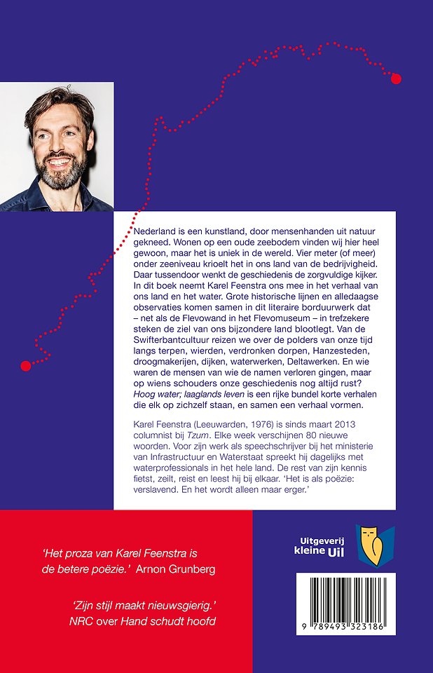 Nederland is een kunstland. Wonen op een oude zeebodem vinden wij hier heel gewoon, maar het is uniek in de wereld. Vier meter (of meer) onder zeeniveau krioelt het in ons land van de bedrijvigheid. Daar tussendoor wenkt de geschiedenis de zorgvuldige kijker. In deze bundel neemt Karel Feenstra ons mee in het verhaal van ons land en het water. Grote historische lijnen en alledaagse observaties komen samen in dit literaire borduurwerk dat – net als de Flevowand in het Flevomuseum – in trefzekere steken de ziel van ons bijzondere land blootlegt. Van de Swifterbantcultuur reizen we over de polders van onze tijd langs terpen, wierden, verdronken dorpen, Hanzesteden, droogmakerijen, dijken, waterwerken, Deltawerken. En wie waren de mensen van wie de namen verloren gingen, maar op wiens schouders onze geschiedenis nog altijd rust? Hoog water is een rijke bundel korte verhalen die elk op zichzelf staan, en samen een verhaal vormen.