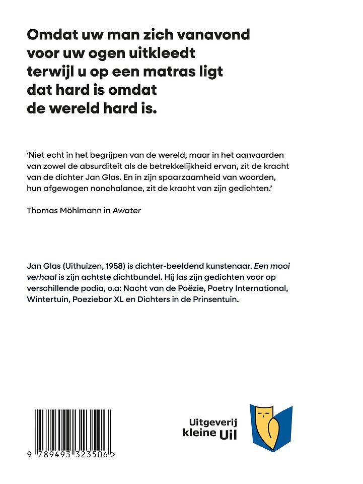 ‘Niet echt in het begrijpen van de wereld, maar in het aanvaarden van zowel de absurditeit als de betrekkelijkheid ervan, zit de kracht van de dichter Jan Glas. En in zijn spaarzaamheid van woorden, hun afgewogen nonchalance, zit de kracht van zijn gedichten.’
