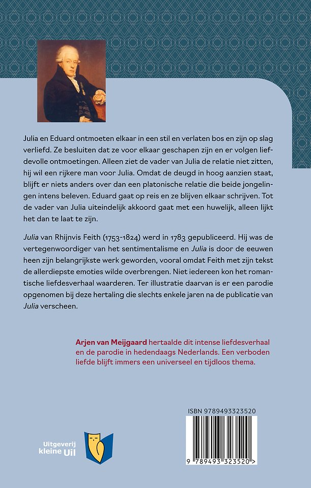 Julia van Rhijnvis Feith (1753-1824) werd in 1783 gepubliceerd. Hij was de vertegenwoordiger van het sentimentalisme en Julia is door de eeuwen heen zijn belangrijkste werk geworden, vooral omdat Feith met zijn tekst de allerdiepste emoties wilde overbrengen. Niet iedereen kon het romantische liefdesverhaal waarderen. Ter illustratie daarvan is er een parodie opgenomen bij deze hertaling die slechts enkele jaren na de publicatie van Julia verscheen.