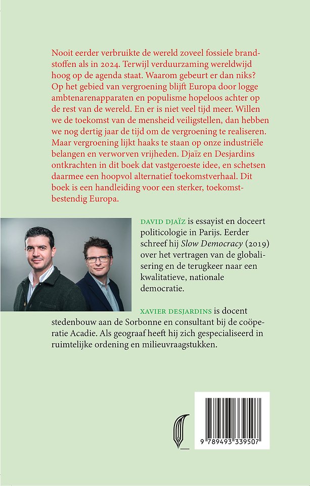 En er is niet veel tijd meer. Willen we de toekomst van de mensheid veiligstellen, dan hebben we nog dertig jaar de tijd om de vergroening te realiseren. Maar vergroening lijkt haaks te staan op onze industriële belangen en verworven vrijheden. Djaïz en Desjardins ontkrachten in dit boek dat vastgeroeste idee, en schetsen daarmee een hoopvol alternatief toekomstverhaal. 'De verplichte revolutie' is een handleiding voor een sterker, toekomstbestendig Europa.