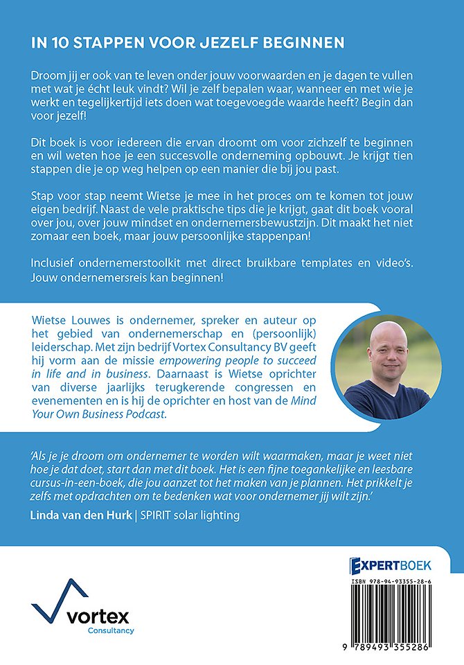 Dit boek is voor iedereen die ervan droomt om voor zichzelf te beginnen en wil weten hoe je een succesvolle onderneming opbouwt. Je krijgt tien stappen die je op weg helpen op een manier die bij jou past. Stap voor stap neemt Wietse je mee in het proces om te komen tot jouw eigen bedrijf. Naast de vele praktische tips die je krijgt, gaat dit boek vooral over jou, over jouw mindset en ondernemersbewustzijn. Dit maakt het niet zomaar een boek, maar jouw persoonlijke stappenpan! Inclusief ondernemerstoolkit met direct bruikbare templates en video's. Jouw ondernemersreis kan beginnen!
