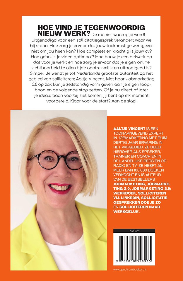 Simpel! Je wendt je tot Nederlands grootste autoriteit op het gebied van solliciteren: Aaltje Vincent. Met haar Jobmarketing 3.0 op zak kun je zelfstandig vorm geven aan je eigen loopbaan en de volgende stap zetten. Of je nu direct of later je ideale baan voorbij ziet komen, jij bent op elk moment voorbereid.
