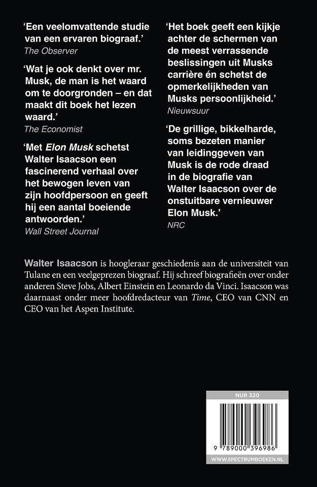 Isaacson volgde Musk twee jaar lang. Hij woonde zijn vergaderingen bij, liep samen met hem door zijn fabrieken en spendeerde uren aan interviews met hem, zijn familie, vrienden, collega’s en vijanden. Het resultaat is een onthullend verhaal van binnenuit, vol met fantastische anekdotes over triomf en beroering, dat maar één vraag doet oplaaien: zijn de demonen die Musk drijven ook hetgeen wat nodig is voor innovatie en vooruitgang?