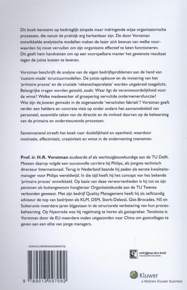 Vorstman beschrijft de analyse van bedrijfsproblemen aan de hand van 'custom-made' structuurmodellen. De juiste opbouw en de invoering van het 'primaire proces' en de cruciale 'rekenschapsrelatie' worden uitgebreid toegelicht.