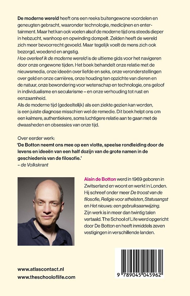 'Hoe overleef ik de moderne wereld' is de ultieme gids voor het navigeren door onze ongewone tijden. Het boek behandelt onze relatie met de nieuwsmedia, onze ideeën over liefde en seks, onze veronderstellingen over geld en onze carrières, onze houding ten opzichte van dieren en de natuur, onze bewondering voor wetenschap en technologie, ons geloof in individualisme en secularisme – en onze verhouding tot rust en eenzaamheid.